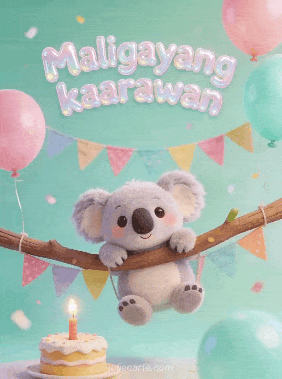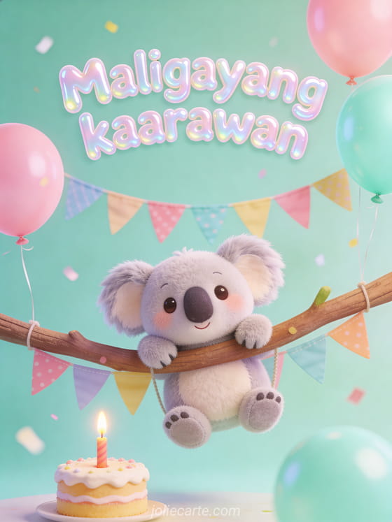 Ipagdiwang ang kaarawan ng isang bata gamit ang kawaii card na ito na may kaakit-akit na koala. Tuklasin din ang cute na kaarawan ecard o kaarawan ecard para sa bata.