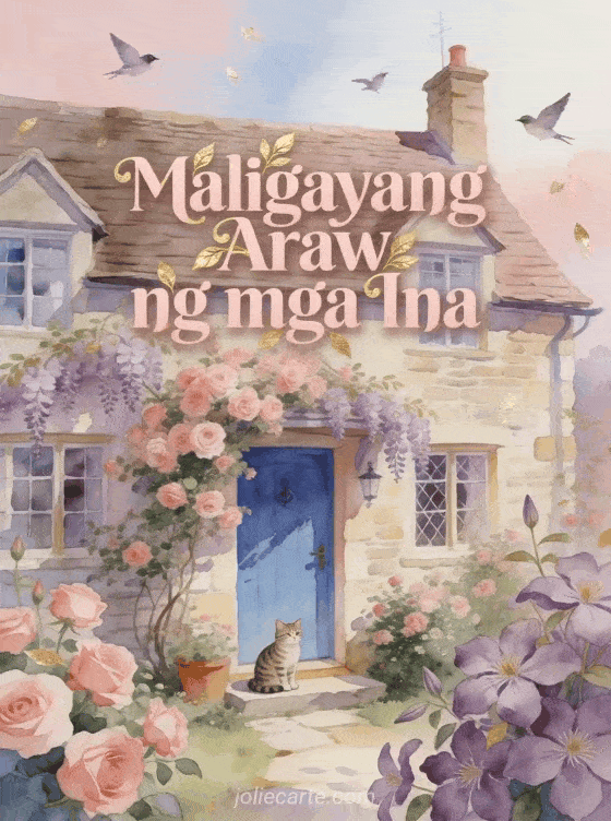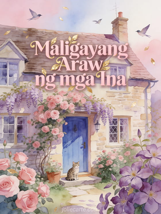 Ipagdiwang ang Araw ng mga Ina gamit ang magandang libreng greeting card na ito. Isang mainit na watercolor na ilustrasyon ng isang magandang English stone cottage na may asul na pinto, napapaligiran ng rosas at lila na clematis, na may isang adorable na tabby na pusa sa pintuan. Tuklasin din ang isang card na may mga larawan para sa Araw ng mga Ina, isang card na may mga larawan para sa nanay o isang floral card para sa Araw ng mga Ina.
