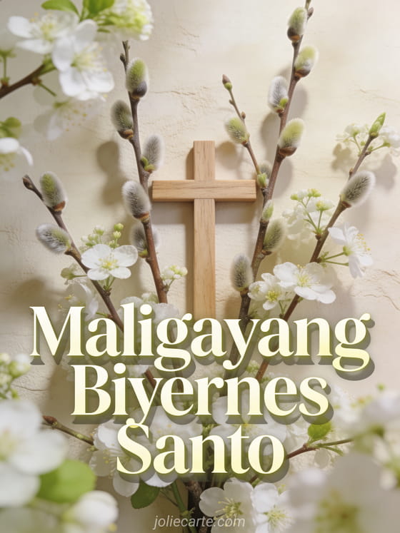 Ibahagi ang pagbati sa Biyernes Santo gamit ang mapayapang card na may simpleng krus na kahoy, mga sanga ng willow, at puting bulaklak sa malambot na liwanag ng tagsibol. Tuklasin din ang card ng Easter weekend, pagbati sa Easter weekend, o maligayang Easter weekend sa lahat.