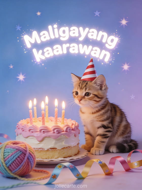 Ipagdiwang ang kaarawan ng isang bata gamit ang matamis na card na may kaakit-akit na tabby kitten. Tuklasin din ang unicorn birthday card o cute baby birthday card.