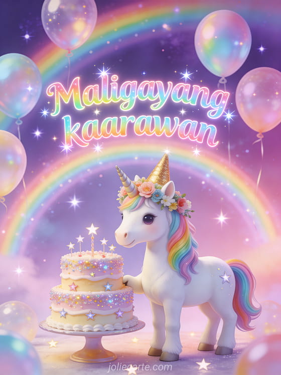Gawing mahiwaga ang kaarawan ng isang bata gamit ang fairy tale card na ito na may rainbow unicorn. Tuklasin din ang card kaarawan baby o card kaarawan para sa bata.