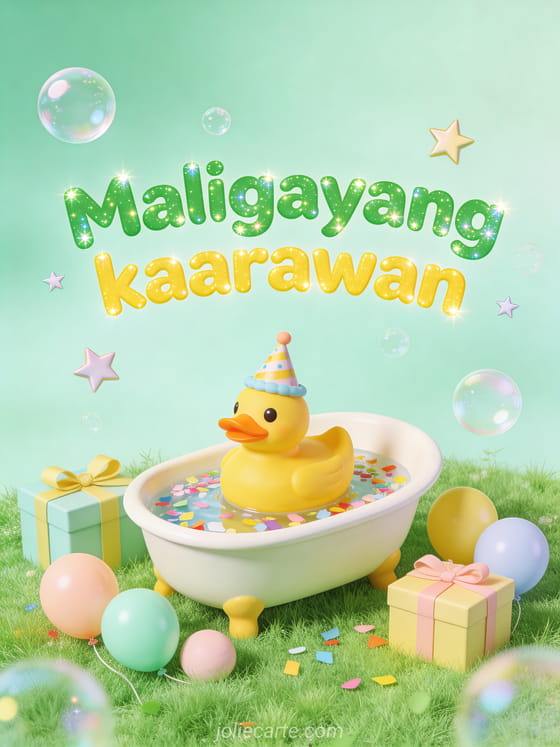 Ipagdiwang ang kaarawan ng isang baby gamit ang masayang card na may kaakit-akit na rubber duck. Tuklasin din ang card kaarawan kitten o unicorn birthday card.