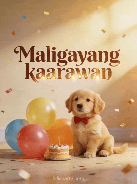 Pasayahin ang kaarawan ng isang tao gamit ang magandang card na ito na may adorable na golden retriever puppy na may pulang bowtie, nakaupo sa tabi ng makulay na lobo at cake, mainit na gintong ilaw at confetti. Tuklasin din ang kaarawan card na may pusa o isang kaarawan card na may paputok.