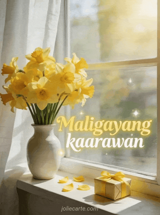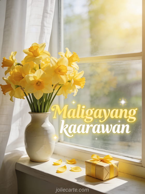 Pasayahin ang espesyal na araw ng isang tao gamit ang magandang kard ng kaarawan na may mga sariwang daffodil sa isang maaraw na bintana. Tuklasin din ang kard ng maligayang kaarawan o isang masayang kard ng kaarawan.
