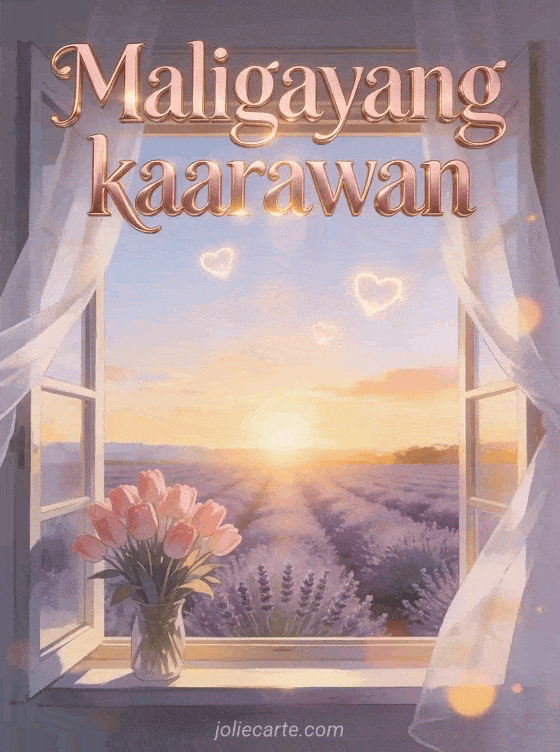 Ipagdiwang ang isang romantikong kaarawan gamit ang magandang card na ito na nagpapakita ng bukas na bintana na nakaharap sa mga taniman ng lavender sa paglubog ng araw, isang bouquet ng rosas na tulips sa bintana, puting kurtina na umaalon sa hangin at mga kumikislap na puso sa kalangitan. Tuklasin din ang birthday card ng pag-ibig o isang romantikong anibersaryo card.