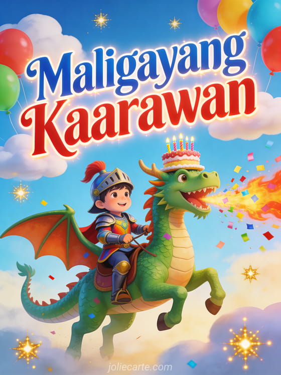 Magpadala ng kahanga-hangang birthday card na may matapang na munting kabalyero na nakasakay sa magiliw na dragon na nagkakalat ng confetti. Perpekto para sa espesyal na araw ng isang bata. Tuklasin din ang birthday card para sa mga bata o isang birthday card na may larawan para sa bata.
