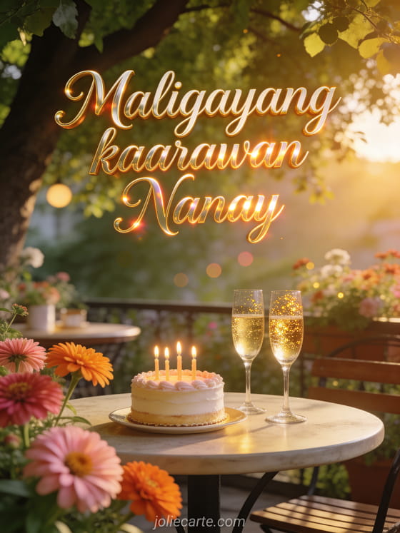 Ipadala ang magiliw na kaarawan card para kay Nanay na may eleganteng birthday cake at kumikinang na champagne sa terasa ng cafe na may bulaklak sa ilalim ng puno ng tilo sa gintong pagsikat ng araw. Tuklasin din ang isang mensahe ng kaarawan para kay Nanay o isang card para sa pinakamahusay na nanay.