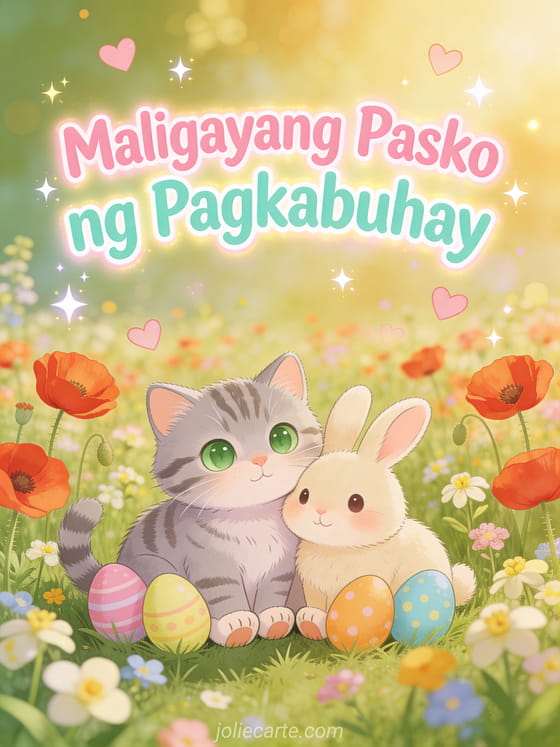 Pasayahin ang mga maliliit gamit ang kaibig-ibig na card na ito ng Maligayang Pasko ng Pagkabuhay na may tabby na pusa at kuneho na magkayakap sa taniman ng poppy at daisy, napapaligiran ng mga makukulay na itlog ng Pasko ng Pagkabuhay. Isang kawaii na ilustrasyon na puno ng kagalakan at pagmamahal. Tuklasin din ang card ng mga hayop ng Pasko ng Pagkabuhay o isang video card ng kuneho ng Pasko ng Pagkabuhay.