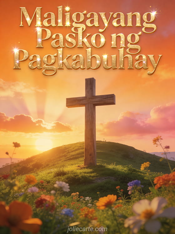 Ipagdiwang ang kagalakan ng Pasko ng Pagkabuhay sa pamamagitan ng magandang relihiyosong card na ito na may krus sa paglubog ng araw. Isang makabuluhan at libreng paraan para bumati ng maligayang Pasko ng Pagkabuhay.