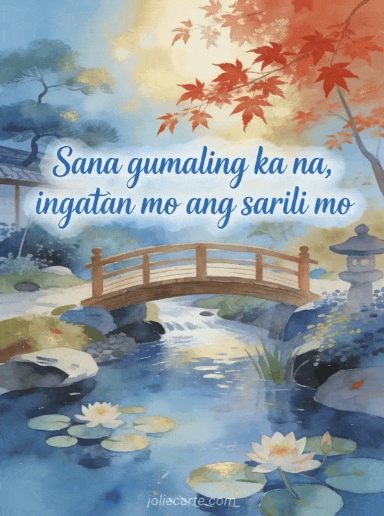 Ipadala ang magandang card ng paggaling na ito na may zen na Hapong hardin na may tulay na kahoy at namumulaklak na water lily para magnais ng mabilis na paggaling. Tuklasin din ang card ng paggaling mahal ko o ang card ng pag-ibig at paggaling o ang card ng mabilis na paggaling.