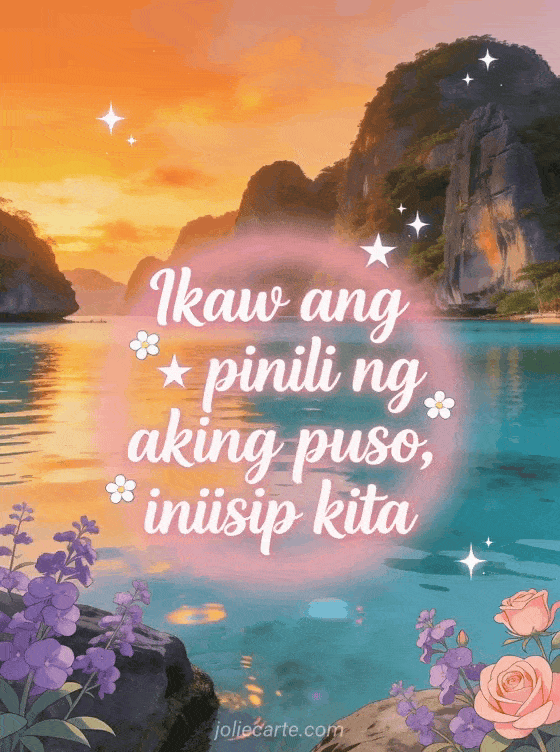 Sabihin sa kanya na iniisip mo siya gamit ang malambot na romantikong card na ito na may lagon ng El Nido sa Palawan sa paglubog ng araw na may lila na bulaklak at mga bituin. Tuklasin din ang isang card na iniisip kita nang sobra mahal ko o isang card na iniisip kita na may halik.