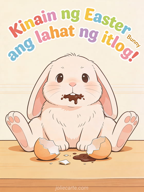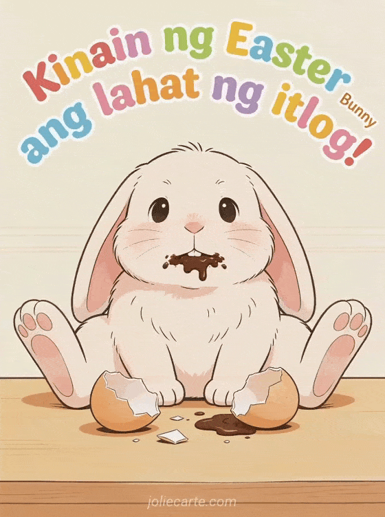 Magpadala ng nakakatawang pagbati sa Pasko ng Pagkabuhay na may mataba at kuneho na nahuli matapos kainin ang lahat ng itlog. Tuklasin din ang nakakatawang larawan ng Pasko ng Pagkabuhay o pagbati ng Pasko ng Pagkabuhay na may humor at masayang card ng Pasko ng Pagkabuhay.