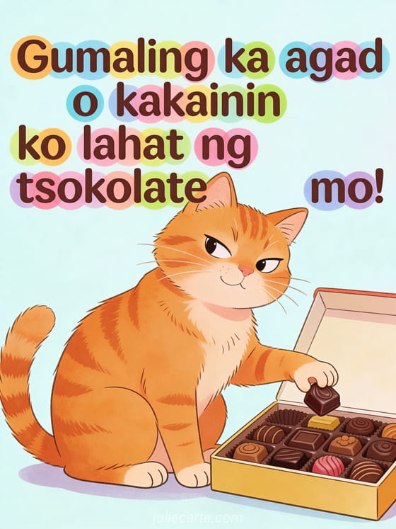 Pasayahin ang may sakit na kaibigan o mahal sa buhay gamit ang nakakatawang card na ito. Isang pilyang pusang nagbabantang kainin ang lahat ng tsokolate kung hindi ka agad gagaling.