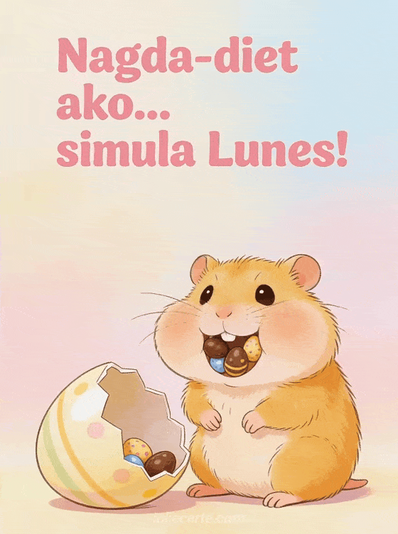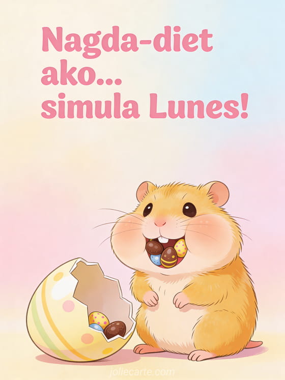 Magbahagi ng magandang tawanan ngayong Pasko ng Pagkabuhay gamit ang nakakatawang card na ito tungkol sa diet at mga chocolate eggs. Ang perpektong paraan para bumati ng masayang Pasko ng Pagkabuhay.