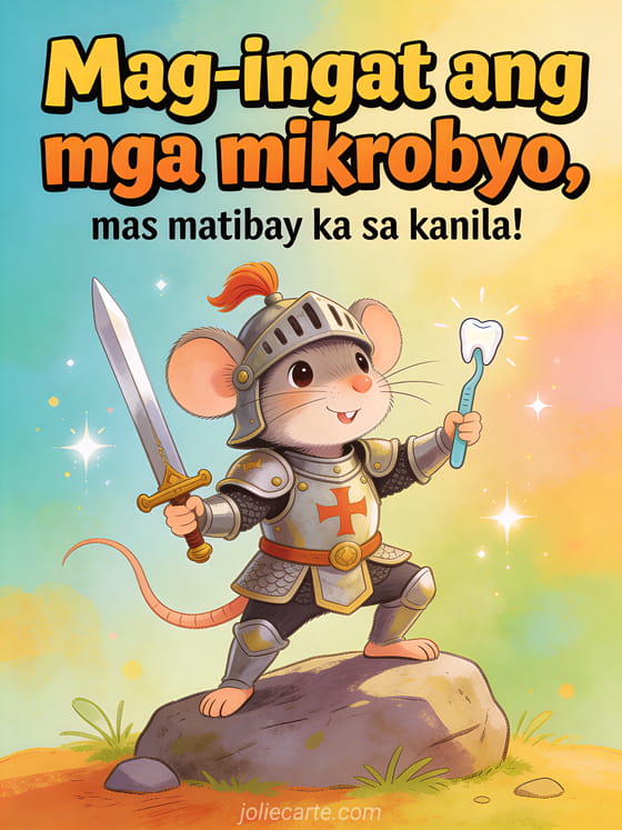 Magpadala ng nakakatawa at matapang na get well mensahe sa isang lumalaban sa sakit. Ang magandang card na ito na may matapang na daga sa armor ng kabalyero ay tiyak na magpapalakas ng loob. Tuklasin din ang isang nakakatawang Doctor Google card o isang nakakatawang card na may matapang na daga.