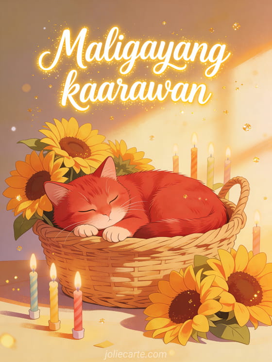 Magpadala ng malambot na maligayang kaarawan gamit ang komportableng card na ito na may pulang pusa na natutulog sa pagitan ng mga sunflower at birthday kandila. Tuklasin din ang birthday card paputok o ang birthday card bundok o ang birthday card tamasahin bawat sandali.