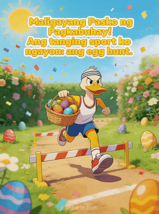 Magpadala ng nakakatawang GIF ng Pasko ng Pagkabuhay na may isportang bibe na tumatakbo sa hardin na naghahanap ng mga itlog. Ang tanging sport na dapat gawin ngayon! Tuklasin din ang nakakatawang mga larawan ng Pasko ng Pagkabuhay o GIF ng Pasko ng Pagkabuhay na may humor at nakakatawang card ng Pasko ng Pagkabuhay.
