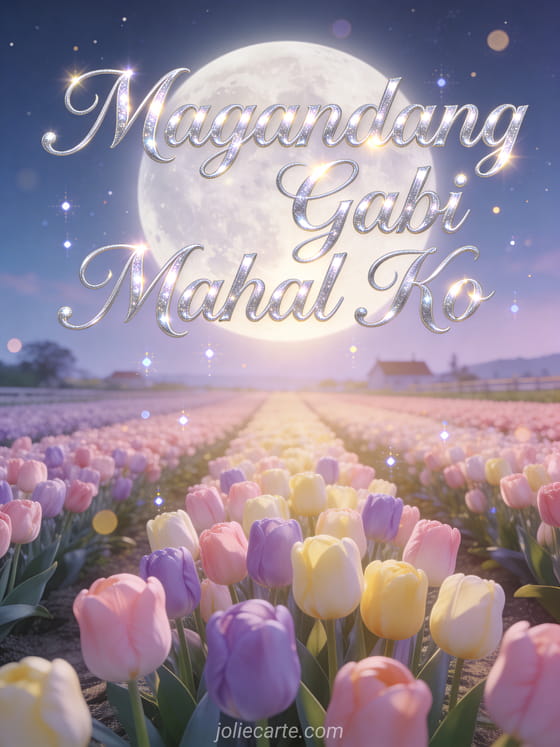 Magandang Gabi Mahal Ko isang romantikong good night card na may mga tulip sa ilalim ng buwan