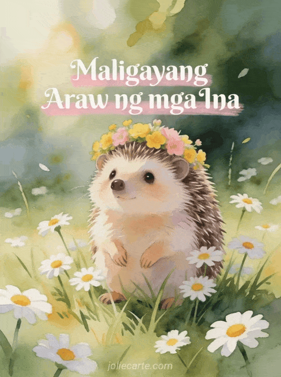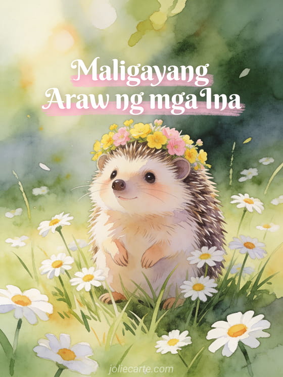 Ipagdiwang ang iyong Mama sa adorable na Maligayang Araw ng mga Ina card na may cute na hedgehog na may korona ng mga dilaw at pink na bulaklak sa gitna ng mga daisy. Tuklasin din ang libreng Mother's Day card o isang Mother's Day greeting card.