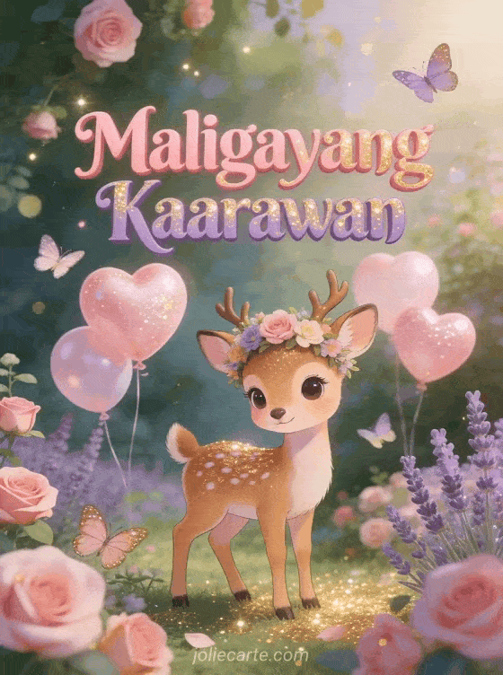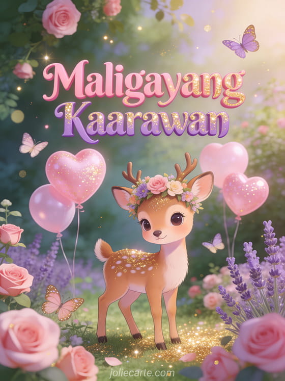 Magpadala ng kahanga-hangang birthday card na may kaibig-ibig na munting usa na may korona ng bulaklak sa isang mahiwagang hardin na puno ng paru-paro at pink na heart balloon. Perpekto para sa kaarawan ng isang batang babae. Tuklasin din ang birthday card para sa mga batang lalaki o isang template ng birthday card para sa mga bata.
