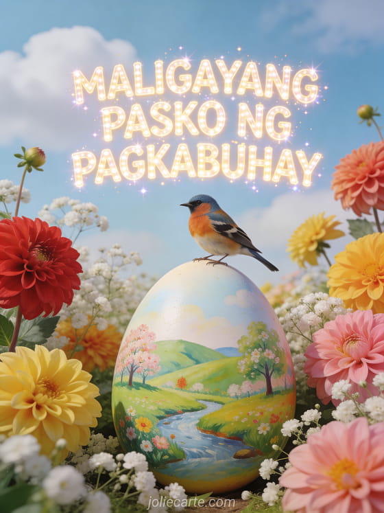 Pasayahin ang Pasko ng Pagkabuhay ng isang tao gamit ang nakasisilaw na video card na ito. Isang kaakit-akit na goldfinch ang nakapatong sa isang higanteng Easter egg na pinintahan ng tagsibol na tanawin, napapaligiran ng makulay na dahlia at baby's breath sa ilalim ng malambot na kalangitan. Tuklasin din ang isang card ng mensahe sa Pasko ng Pagkabuhay o isang card ng pagbati sa Pasko ng Pagkabuhay.