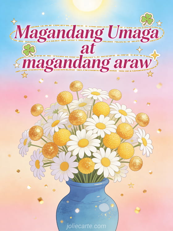 Simulan ang araw gamit ang maliwanag na card na ito na may bouquet ng buttercup at daisy sa asul na plorera, four-leaf clover, maaliwalas na asul na langit at gintong sparkle. Tuklasin din ang isang magandang araw card na may halik o isang magandang araw card na may humor.