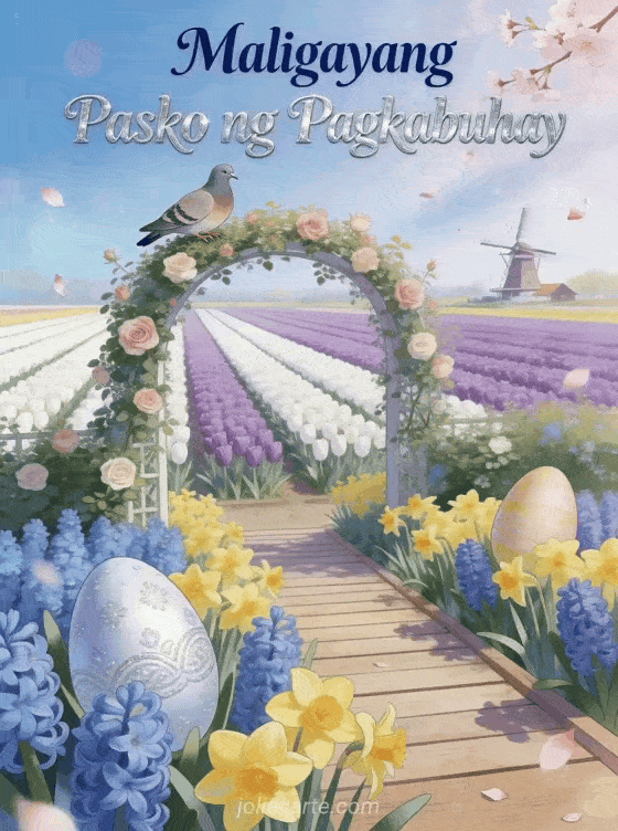 Ipagdiwang ang Pasko ng Pagkabuhay gamit ang kahanga-hangang libreng animated greeting card na may isang kalapati na nagpapahinga sa arko ng hardin na may rosas sa Keukenhof na may mga puting at violet na tulip field, Easter egg sa pugad, at isang Dutch windmill. Tuklasin din ang gifs joyeuses paques carte virtuelle gratuite paques.